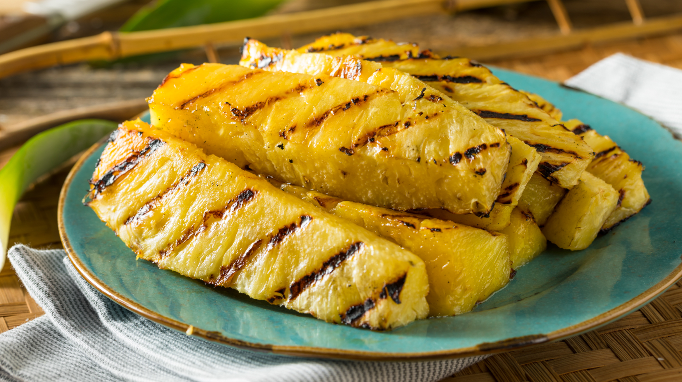 Installer les quartiers d'ananas sur des brochettes métalliques ou en bois. Huiler et saler légèrement les fruits en préparation de la cuisson sur le grill.